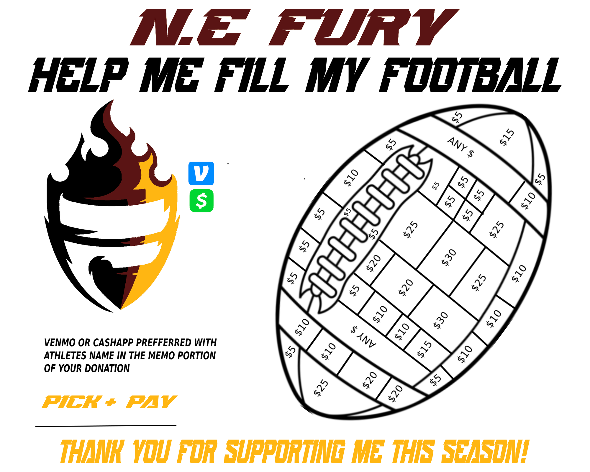 We ask that every player/parent fill their football. To fill your football we ask that you post on social media, ask friends/family to donate in efforts of filling your ball. When a donation is made, you color in the amount that was donated. Filling in your football will result in your registration fee being covered for the 6 tournaments and uniform package.